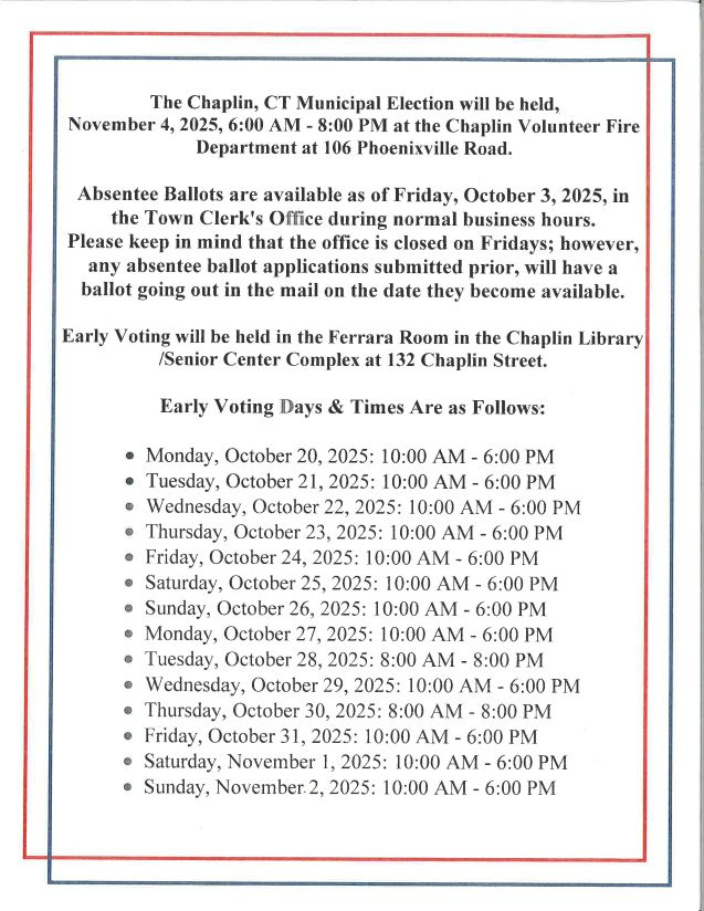 The Chaplin Town Hall, Library, Senior Center and DPW will be closed on Monday, October 13, 2025 in observance of Columbus Day.